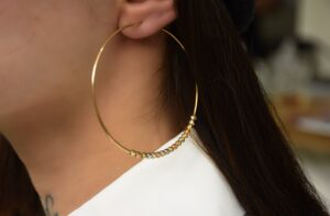 گوشواره حلقه ای البرنادو با گوی های طلای البرنادو که با تراش های زیباییش جلوه ی زیبا تری به گوشواره میدهد